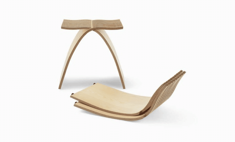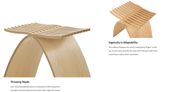 Pondering her new project – to build a better stool – designer Carol Catalano noticed her own entwined fingers and had her answer. The Capelli stool is two identical plywood pieces each with undulating ‘fingers’ at the top that interlock without tools or fasteners. It’s an ingeniously stable and graceful structure that’s pleasant to sit on and simply beautiful to look at.
