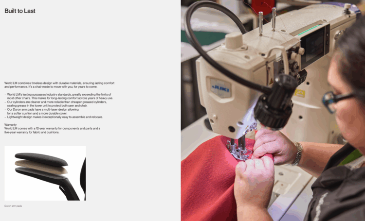 • Inspired by clothing design, World LM’s tri-paneled Form Sensing Mesh back takes on the exact shape of the sitter’s back, as if it were made for them.