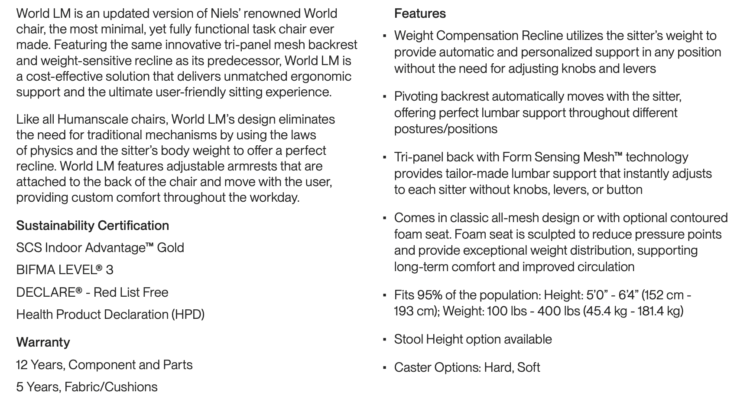 The New Humanscale World LM office chair is a streamlined edition of the original Diffrient World chair, offering the same groundbreaking tri-panel mesh backrest and weight-sensitive recline for effortless ergonomic support.