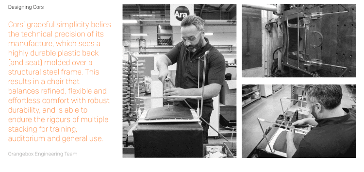 The OrangeBox Cors chair is a robust high stacking universal chair for use in either small groups or within dense function scenarios. The design offers a high level of flexible comfort from an elegant and slim profile design due to the design and pattern of the back and the metal structural frame integrated into the back during the moulding process.