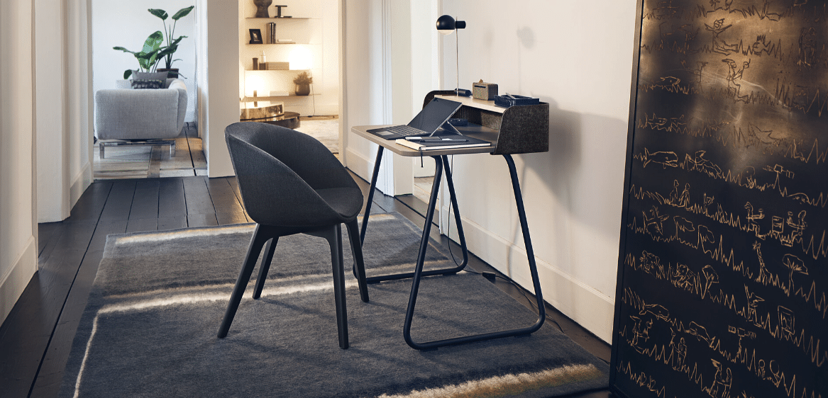 The New Sedus Secretair home personal desk with its Sleek design clear lines and an organic shape. The Secretair stands out due to its light uncluttered appearance.