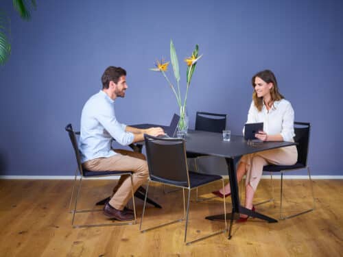 The Viasit Tri Table is a high quality conference table with a contemporary 3 arm powder coated steel frame in matt black.