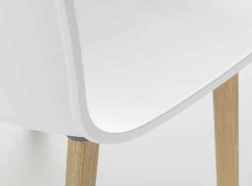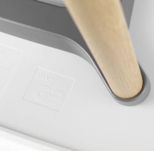 Base: non-stackable wooden base in natural or dark oak. Connecting element between shell and base in die-cast aluminium, powder-coated in dim grey.