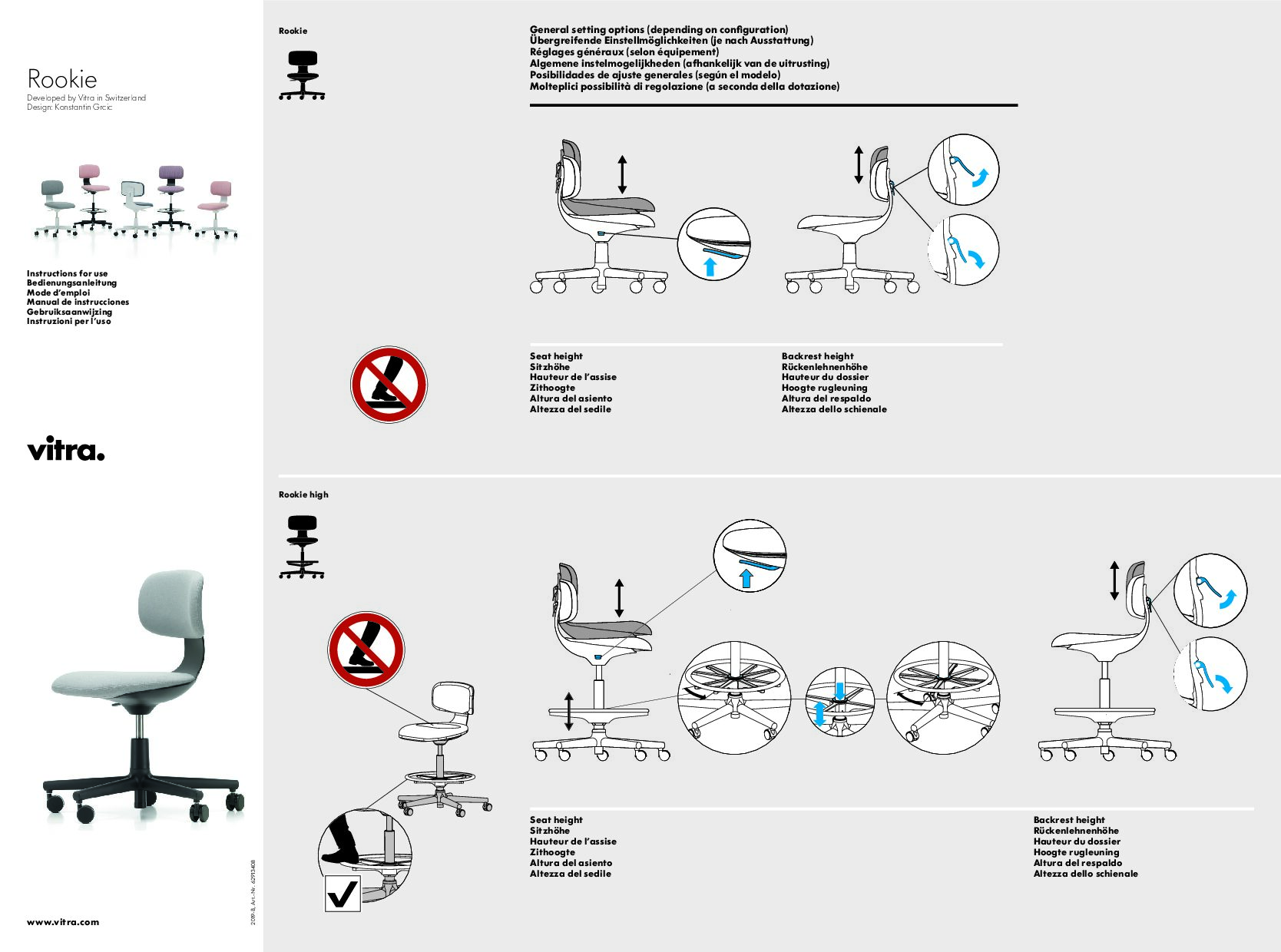 Both the seat and back of Vitra Rookie high chair are adjustable in height. In addition to these classic functions of a task chair, other ergonomic features are directly incorporated into Rookie’s structural design: the backrest flexes slightly when pressure is applied